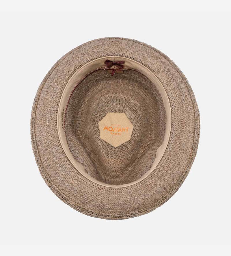 This surf straw hat from Mossant has been handcrafted and is made of 100% raffia straw. It is characterized by its excellent craftsmanship and solid color crochet structure. This airy straw hat is the ideal headgear on warm summer days with its perforated design in the crown. A reinforced cotton lining band enhances the hat`s level of wearing comfort. A narrow feather ribbon band with the metal trademark rounds off the design in style. It is great to combine with leisure outfits.