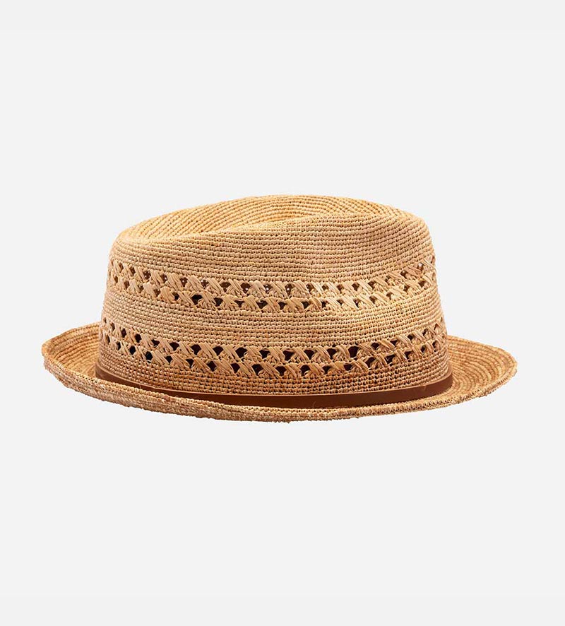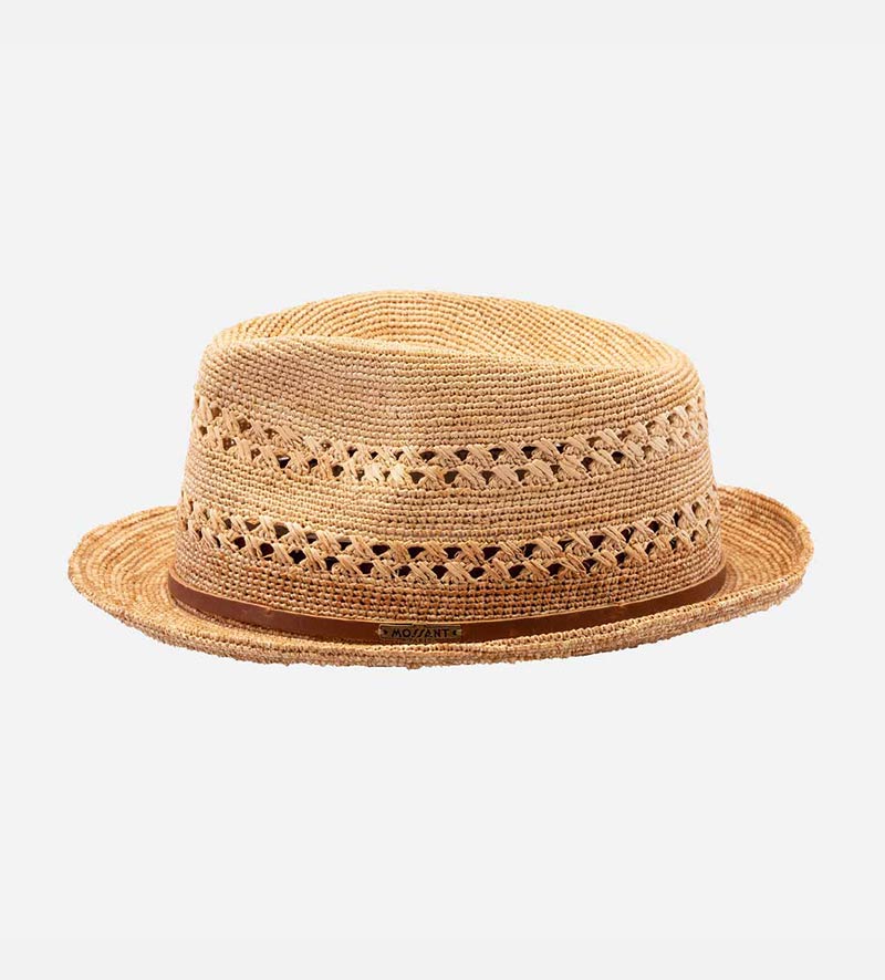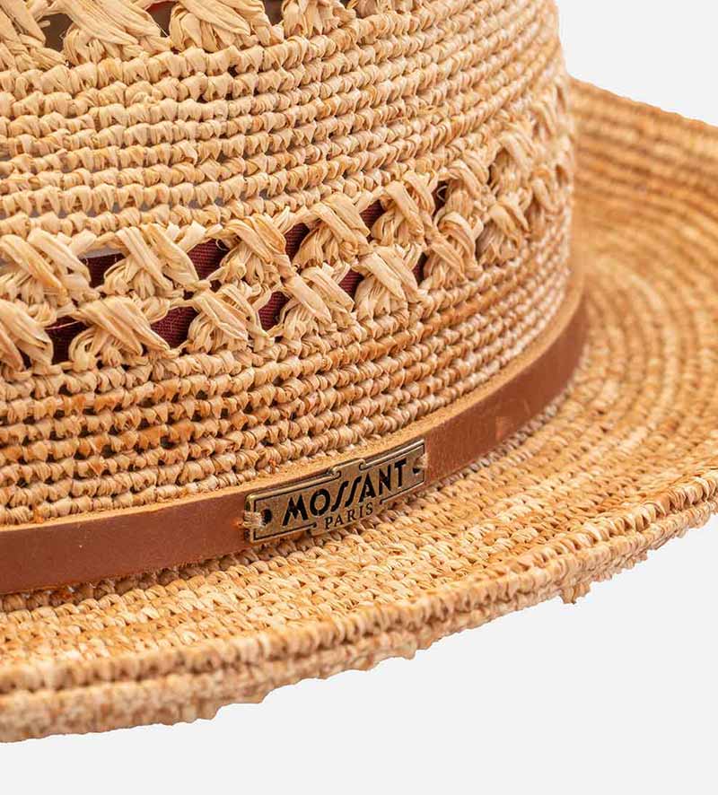 This vented fedora hat from Mossant has been handcrafted and is made of 100% raffia straw. It is characterized by its excellent craftsmanship and solid color crochet structure. This airy straw hat is the ideal headgear on warm summer days with its perforated design in the crown. A reinforced cotton lining band enhances the hat`s level of wearing comfort. A narrow feather ribbon band with the metal trademark rounds off the design in style. It great to combine with leisure outfits.