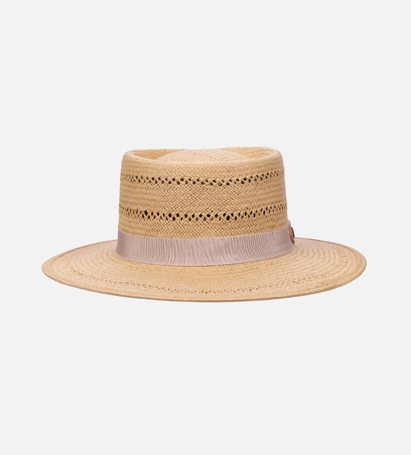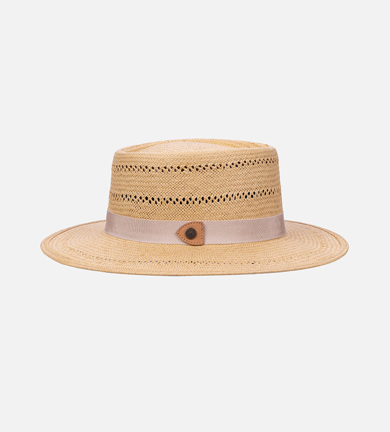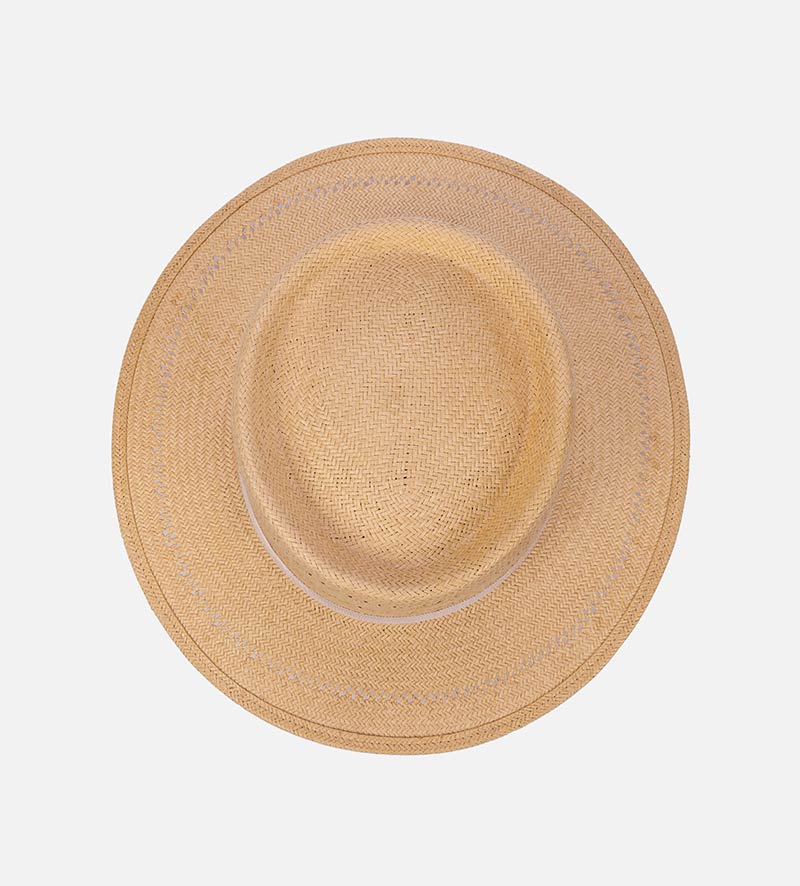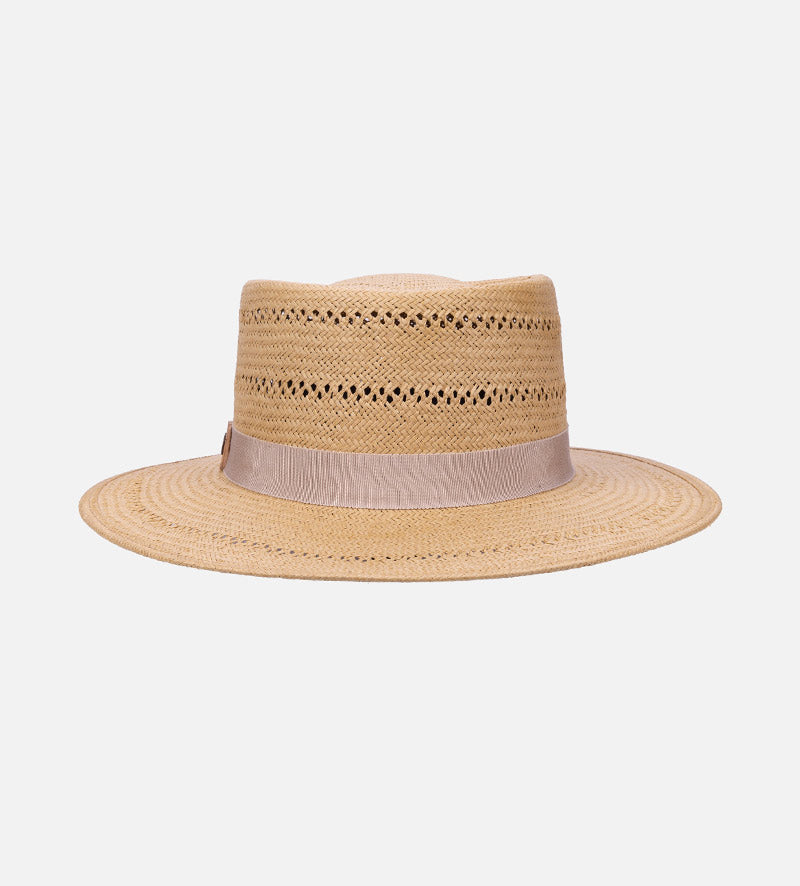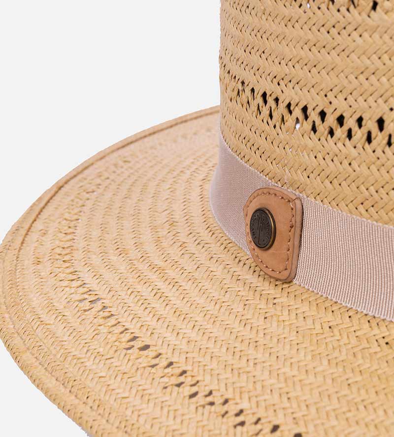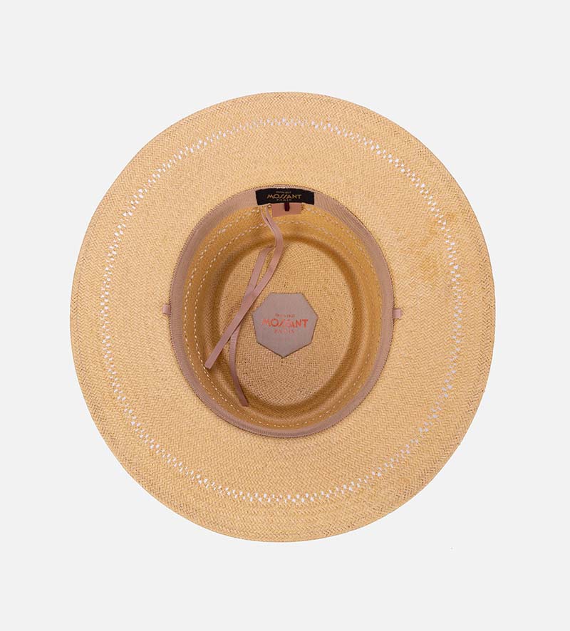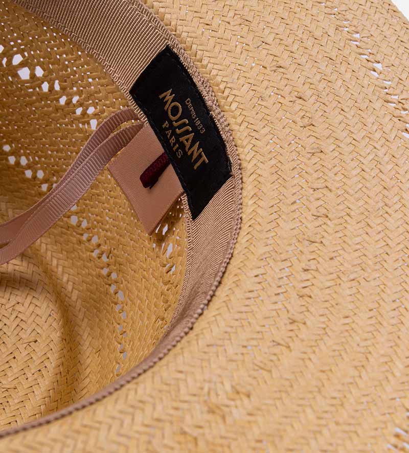 With the classic C-top crown, the plain-colored flat-brim straw hat from Mossant which is made of 100% paper straw and has been carefully crafted shows the traditional stylish. The zigzag perforated pattern both in the crown and the brim brings the modern fashion for the hat. A practical sweatband further optimizes the high level of wearing comfort offered by this summer hat. The plain-colored grosgrain ribbon is an expertly designed eye-catching feature and provides a charming accent with its beautiful color contrast. The round metallic trademark is decorated with a triangular leather pad on the side.