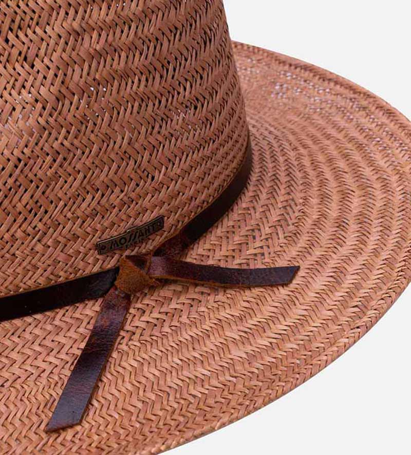 This carefully crafted men's summer straw hat from Mossant is plain-colored in a cheerful shade and made in lightweight palm straw. Above the shady brim, the finely finished straw hat is encircled by a contrast-colored narrow leather ribbon trim that ends in a simple yet elegant bow with a brand emblem. This will allow the summer hat to win you over with its appealing, carefree appearance that will just make you want to go on holiday, whether in the garden, in the park, or on the beach. The high-quality and elegant headgear always proves to be particularly comfortable.