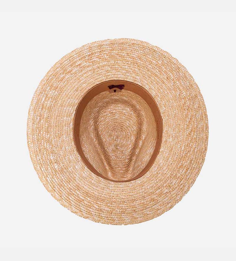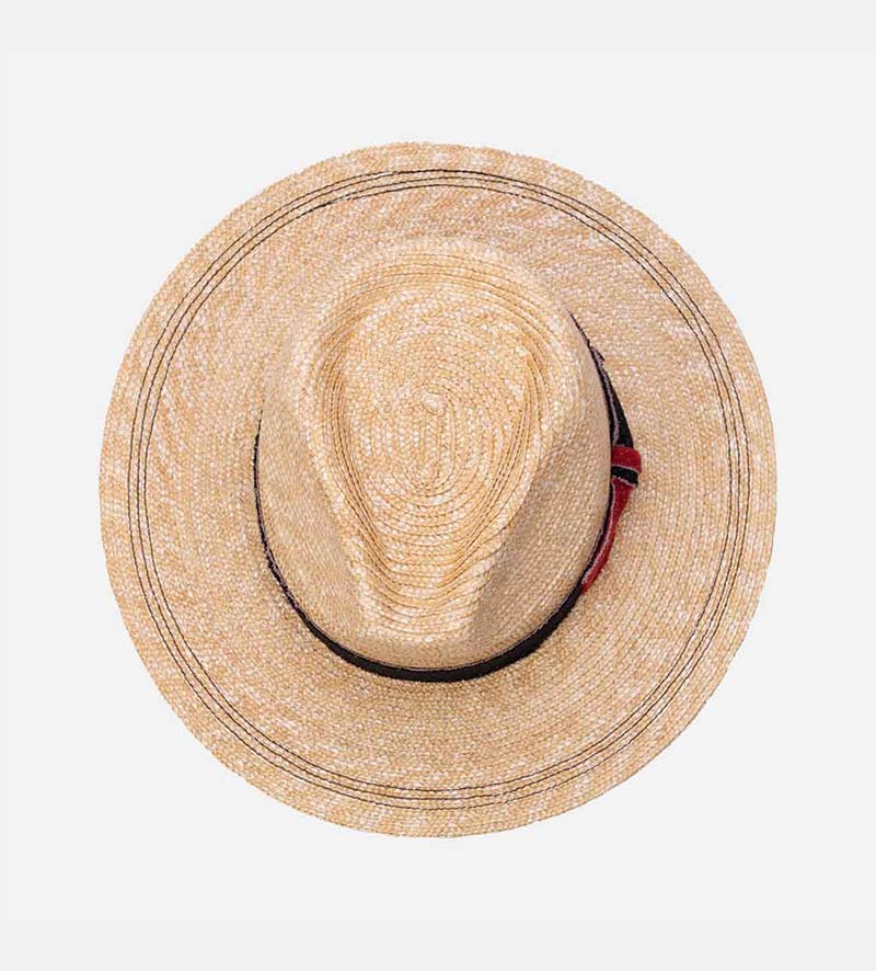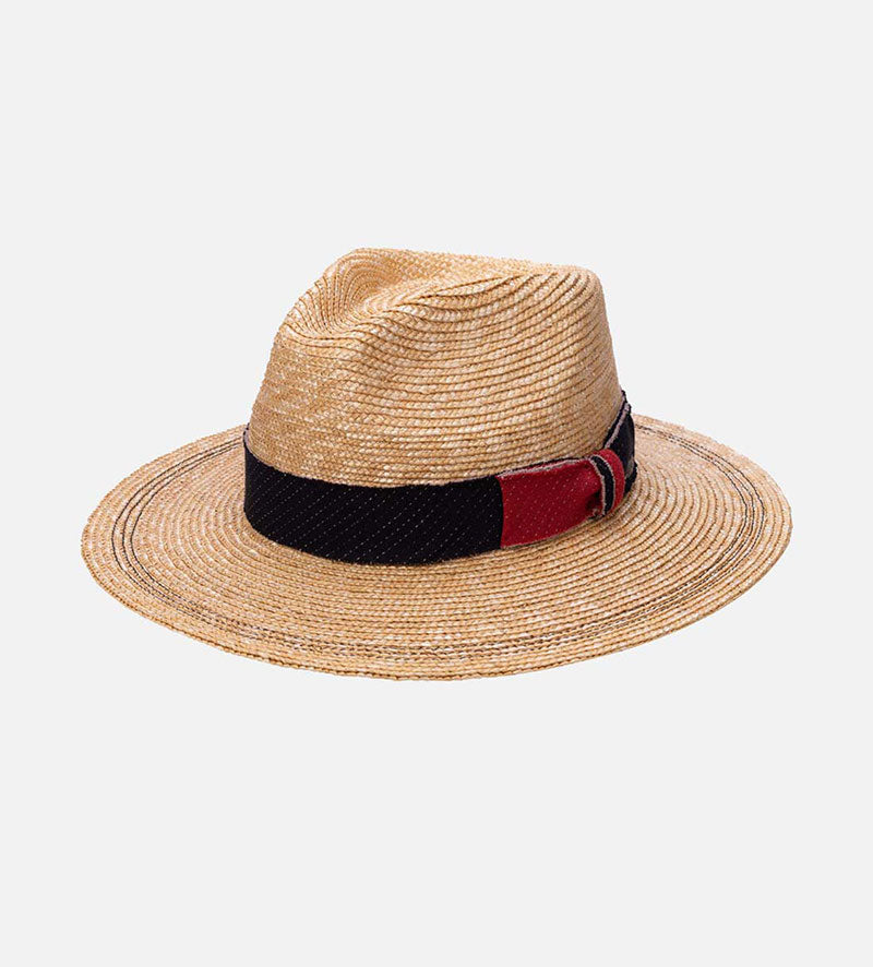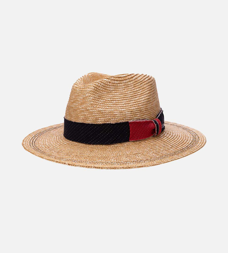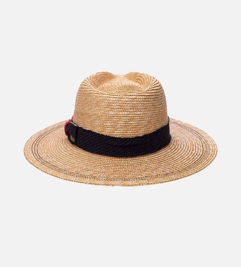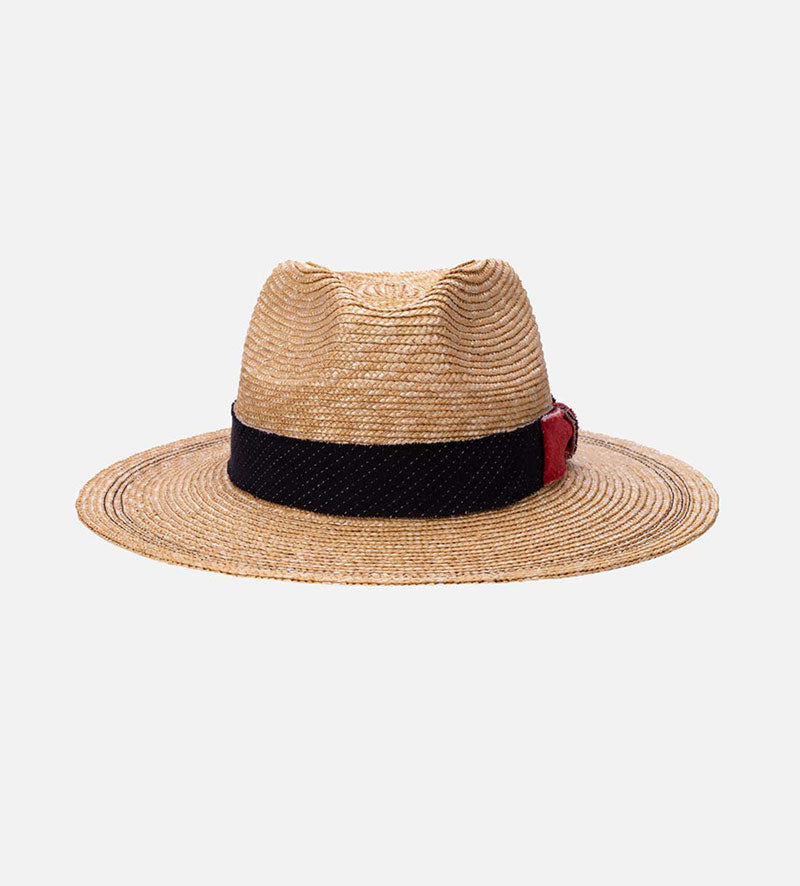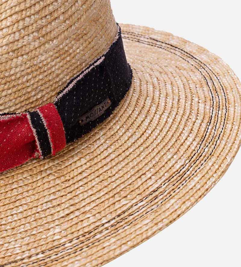 This modern traveler summer straw hat will win you over with the Mossant brand`s high level of quality. In addition to the sophisticated look of the lightweight 100% wheat straw, it is the contrasting decorative trim band with a chunky, structured in a denim effect material by the two-tone bow that draws the eye. The overall look is rounded off by the two rows of contrast-colored stitching in a delicate zigzag pattern that decorates the brim.