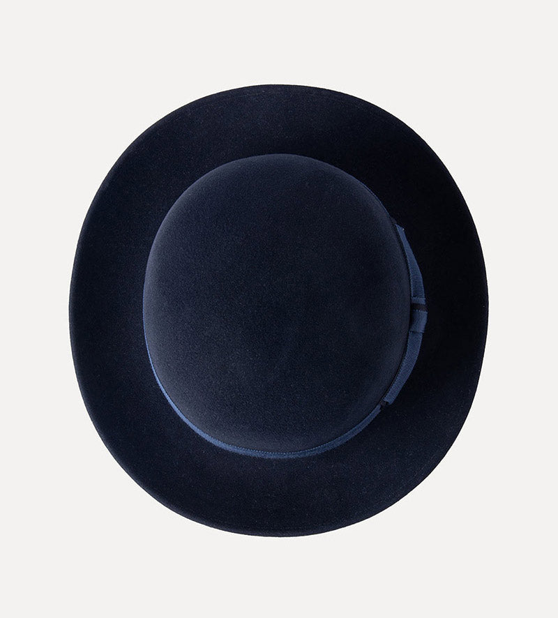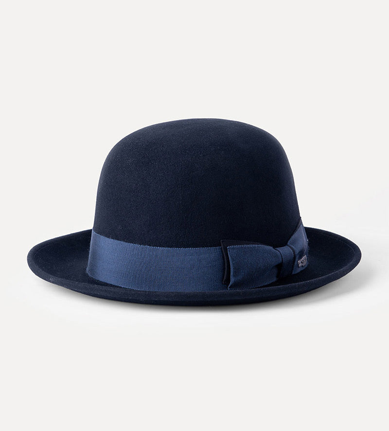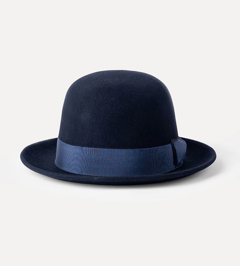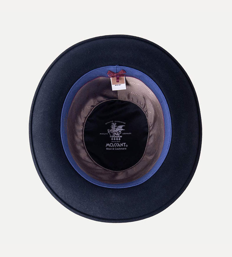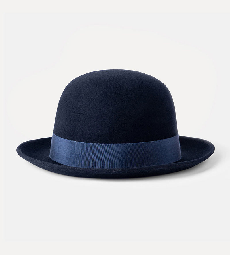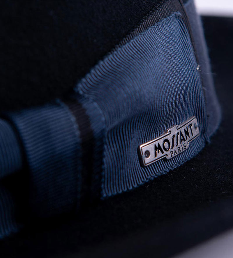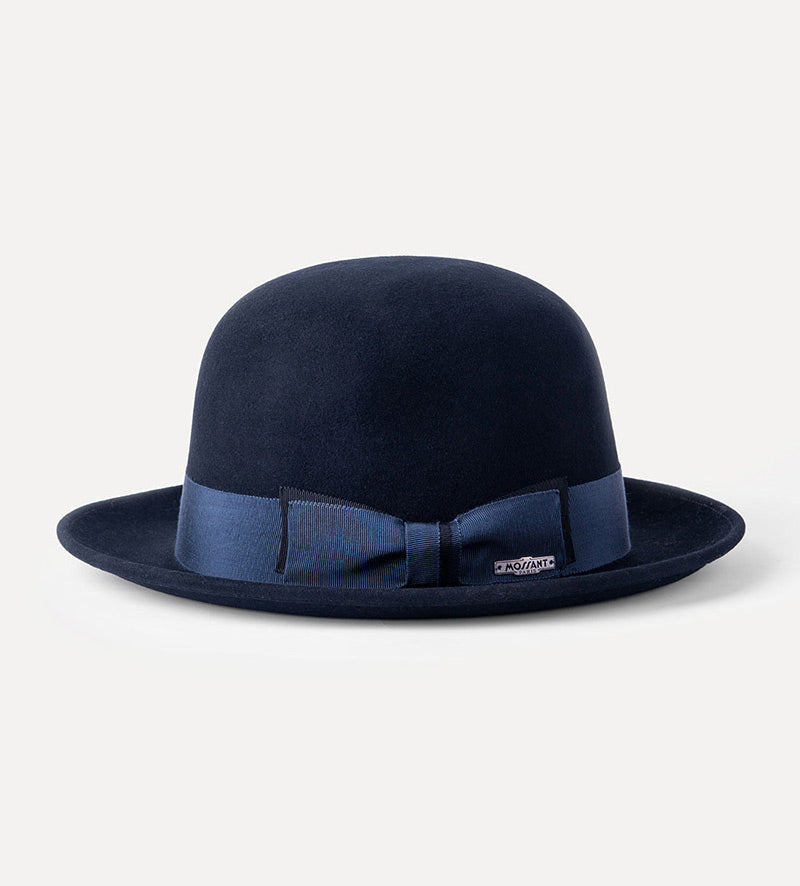 Made of wool and cashmere, this classic black bowler hat from Mossant ensures wearing comfort with the straching lining band The round crown with the brim turned up all the way around looks particularly good in the monochrome colouring. A same-color grosgrain ribbon trim fixed with the metal brand emblem matches the design perfectly and gives your outfit a considerable upgrade.