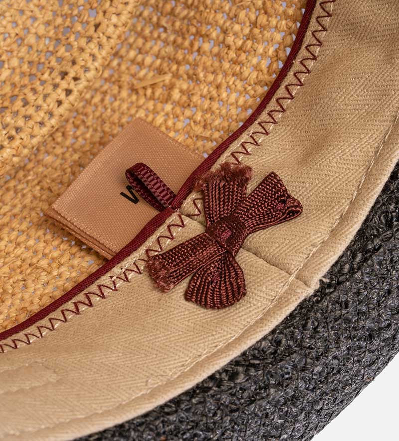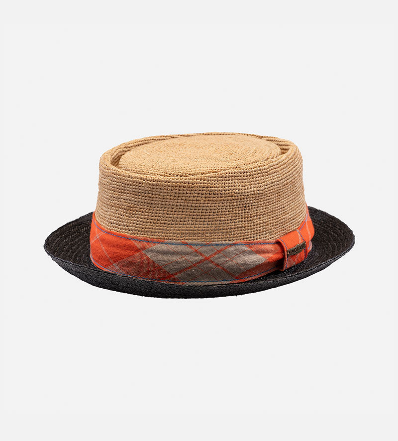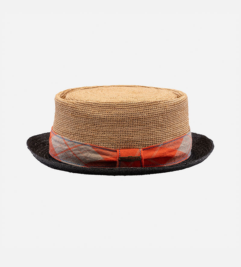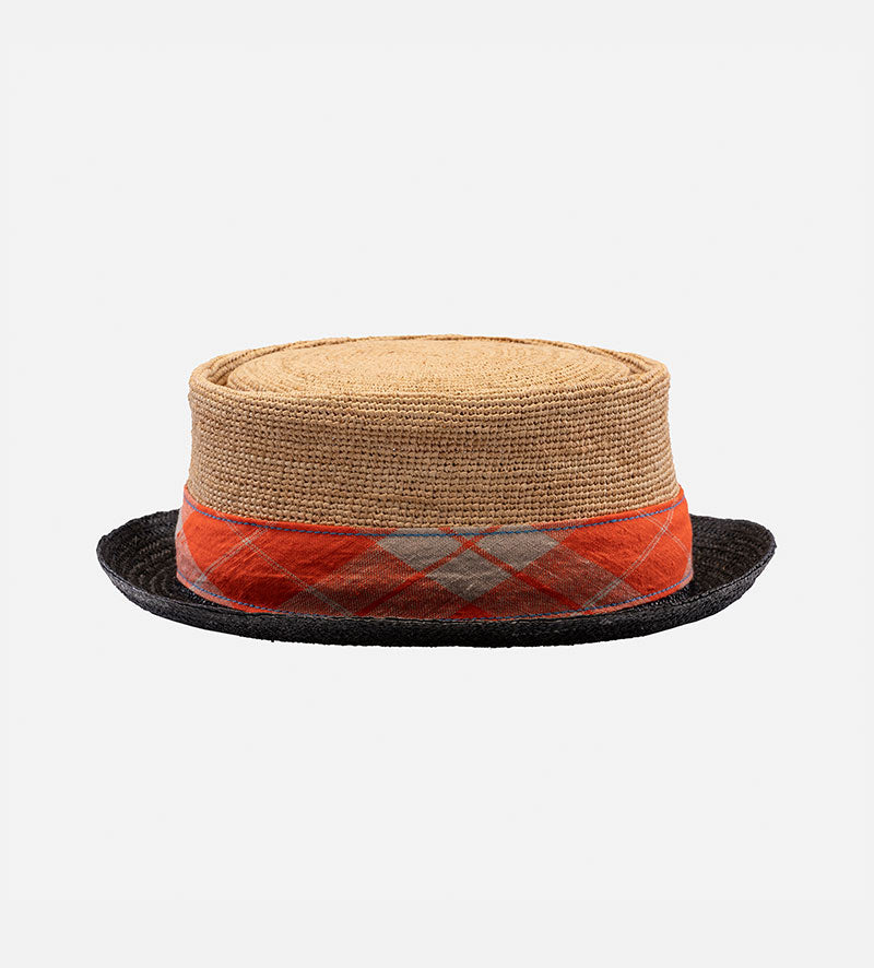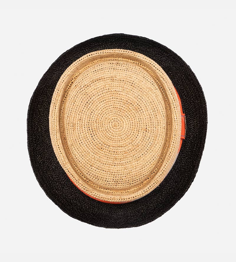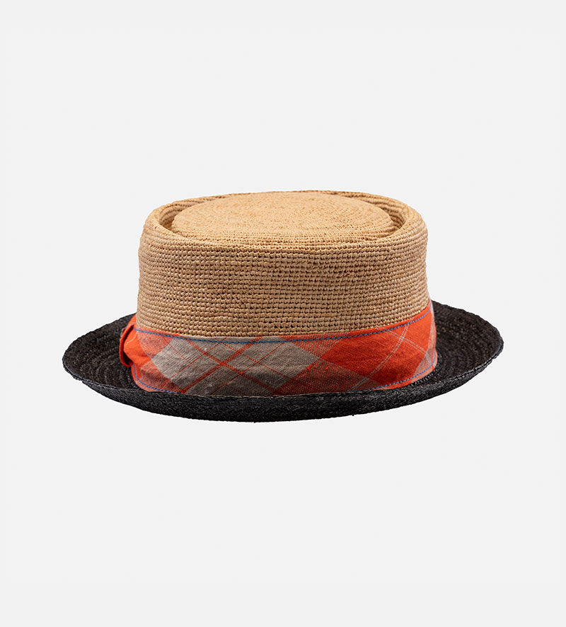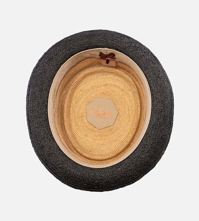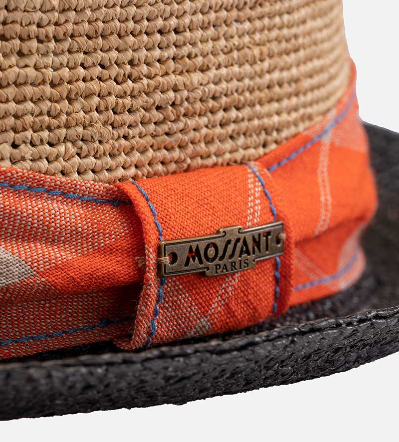 This stylish pork pie hat impresses with the usual high quality of the Mossant brand. The elegant raffia straw gives its summery properties. It is something special with its refined yet equally stylish appearance and stands out from the crowd right down to its brand emblem with its stripe coloring, which provides a stylish contrast to sunshine green grass, and yellow soil. Equipped with natural material, this straw hat provides noteworthy protection against harsh sunshine.