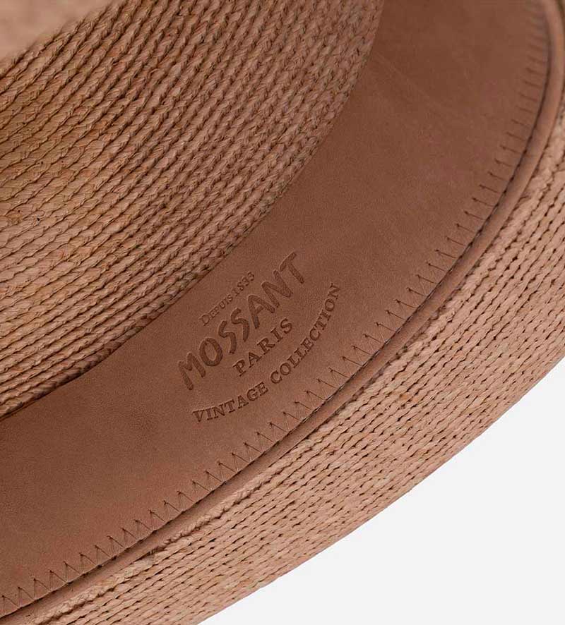 This attractive distressed straw hat from Mossant shows the light distressed effect. Its detailed and carefully crafted weave is made up of 100% raffia straw. It's rounded off by the fabric trim with its frayed edging and three black fine decorative ropes. Two circles of stitching are sewn on the trim and a zigzag pattern is shown on the joint of the fabric. The sweatband is made of a light color leather band which provides a comfortable feel to the wearer.