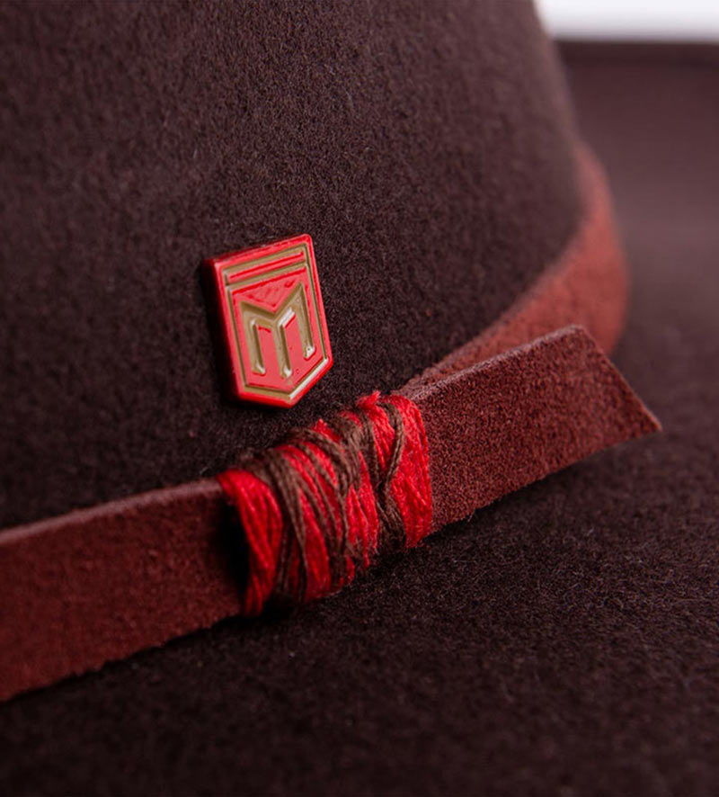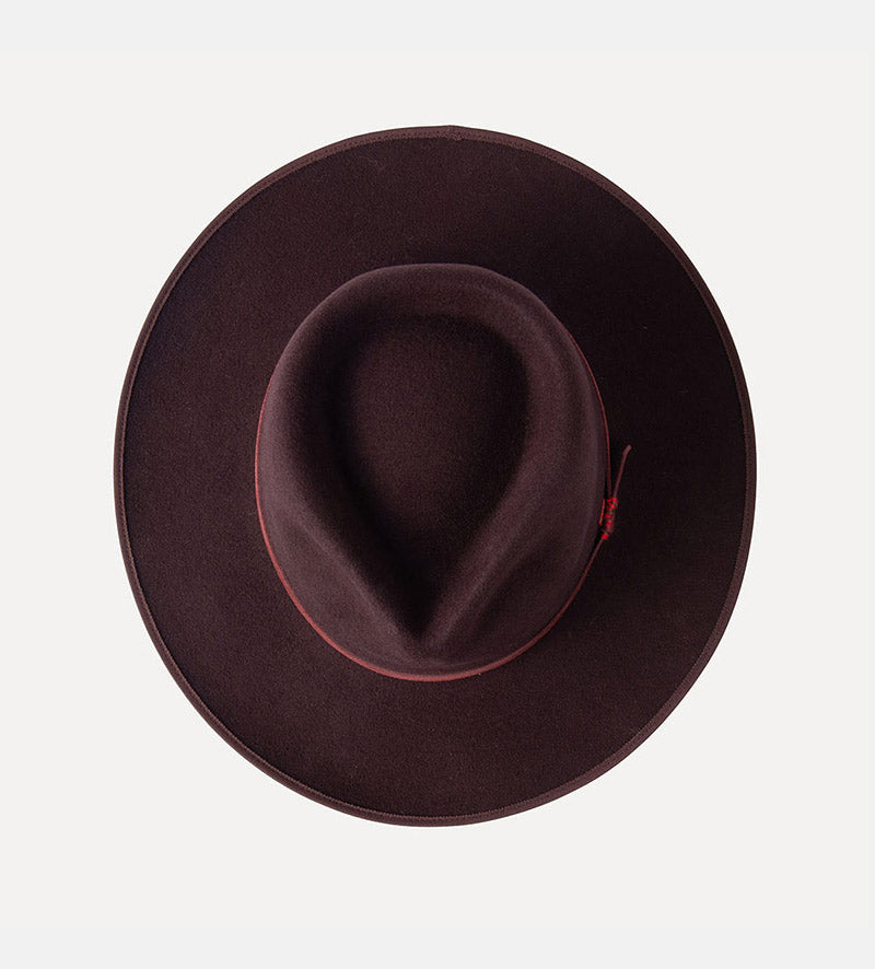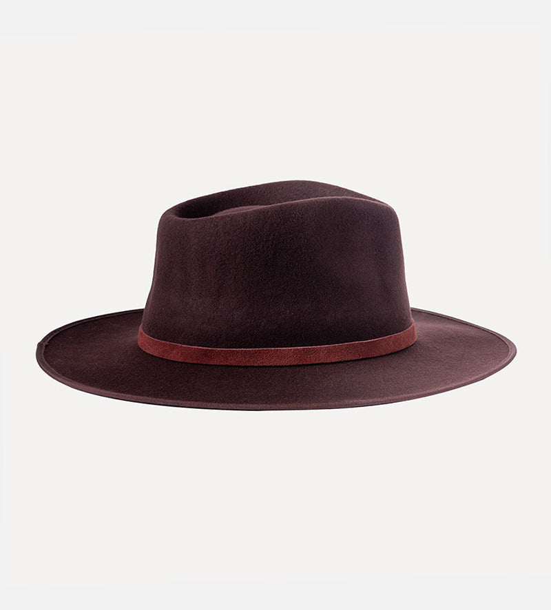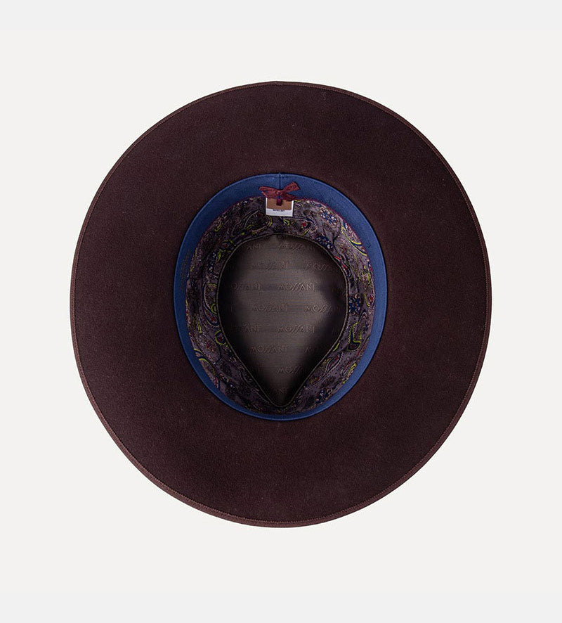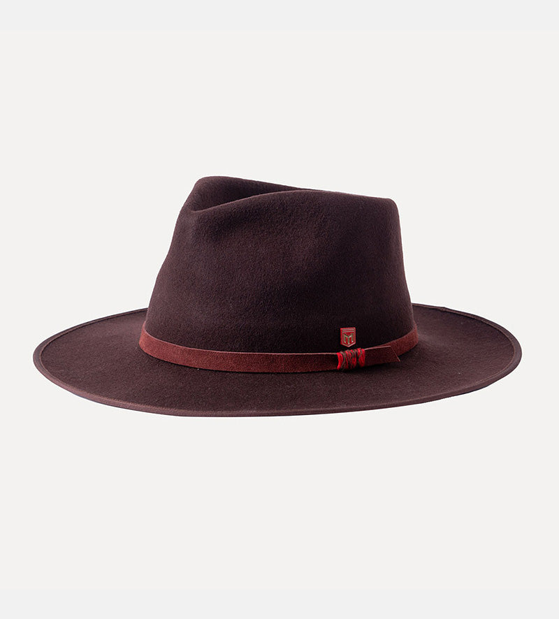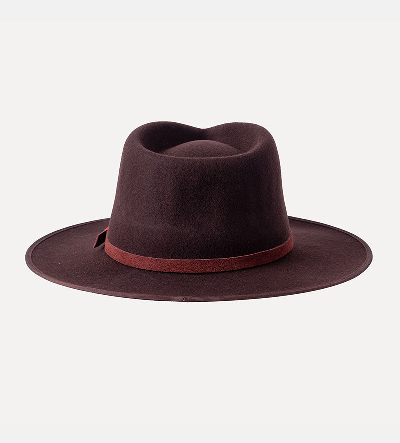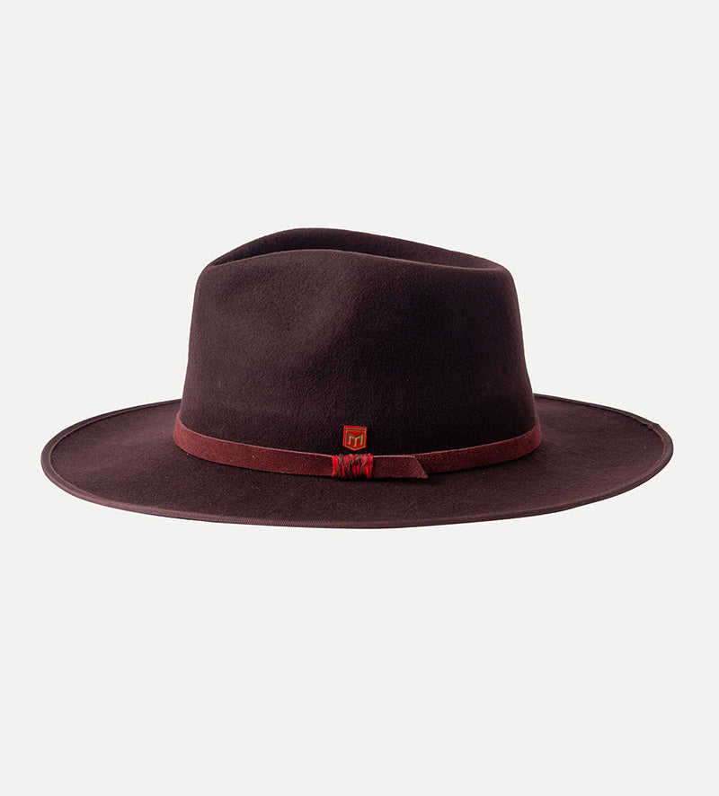 Charming protection when on the go. Made of high-quality, supple wool felt, this flat brim fedora hat from Mossant has its very own charm to it: It comes in a plain-colored design with a wide straight brim and smartly dented crown with sharp hat eyes. The matching-coloured trim with the brand emblem on the side adds a style-conscious accent. This headgear provides flattering protection on everyday trips and also looks great for special occasions.