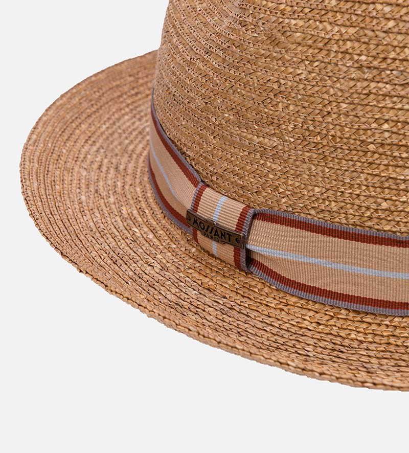 Dressed up for the whole summer, the stylish Mossant fedora nestles against the head with its carefree wearing comfort with 100% wheat straw and a cotton lining, Its cheerful plain-colored appearance is rounded off by a colored grosgrain ribbon trim, edged on the top and bottom in a stylish stripe, and held in place by a metallic brand emblem. It's great to combine with outfits.