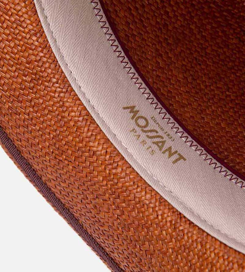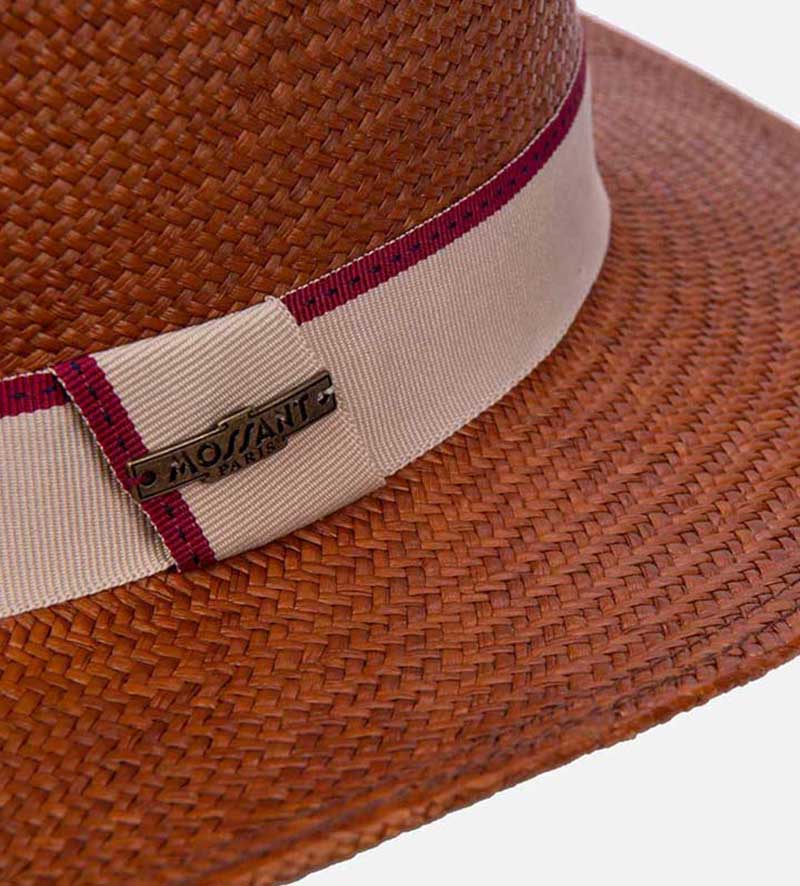 This elegant men's straw Panama hat from Mossant draws the eye with its striking design. It looks particularly carefree and summery ensured by its attractively woven straw. However, its classic-looking shape with indentations and a wide brim, as well as a two-tone grosgrain ribbon contrasting trim band with a parallelogram bow give this high-quality traveler hat a stylish character.
