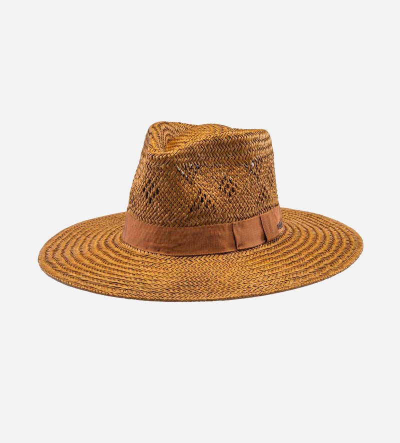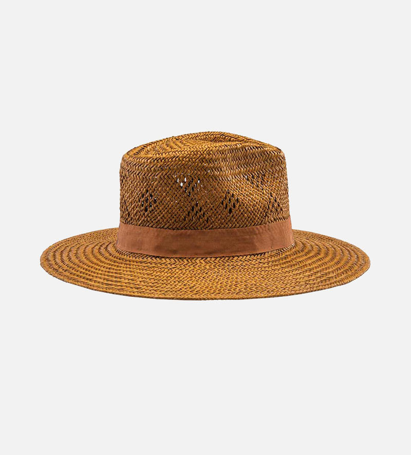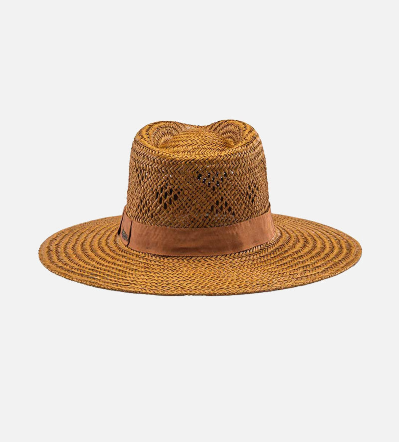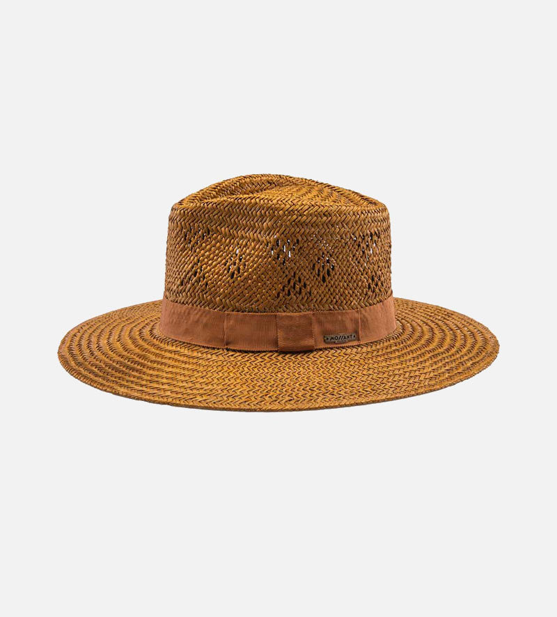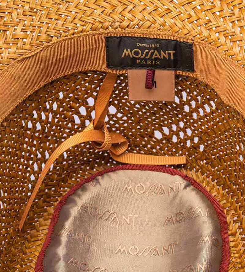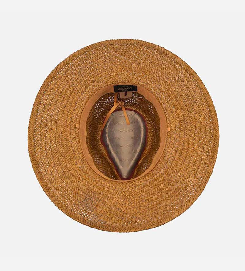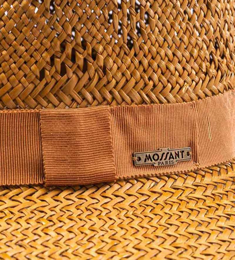 With its pleasantly lightweight material of 100% palm fiber, this stylish wide-brim men's straw sun hat from Mossant exudes irresistible charm. It draws you to sunny climes and wants to be admired. A subtle perforated pattern in the crown and the same color of the grosgrain as the ribbon band with the metallic brand emblem added. The 10cm sweeping brim, provides soothing shade and means it can be at every opportunity.