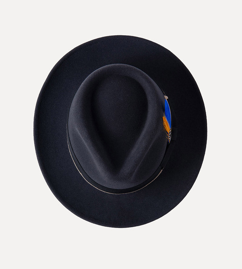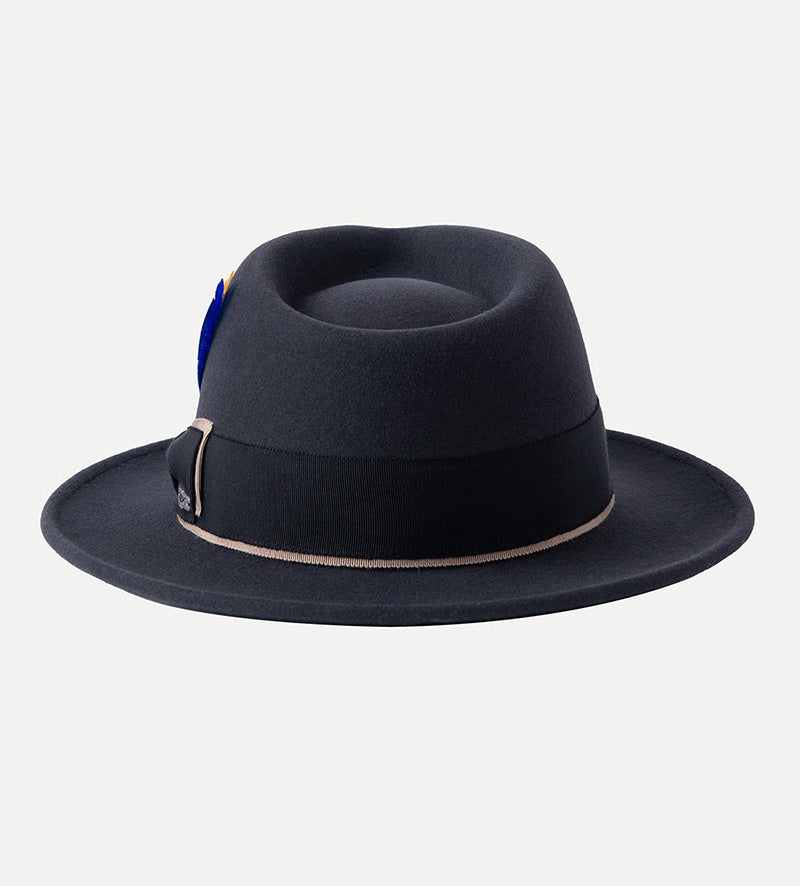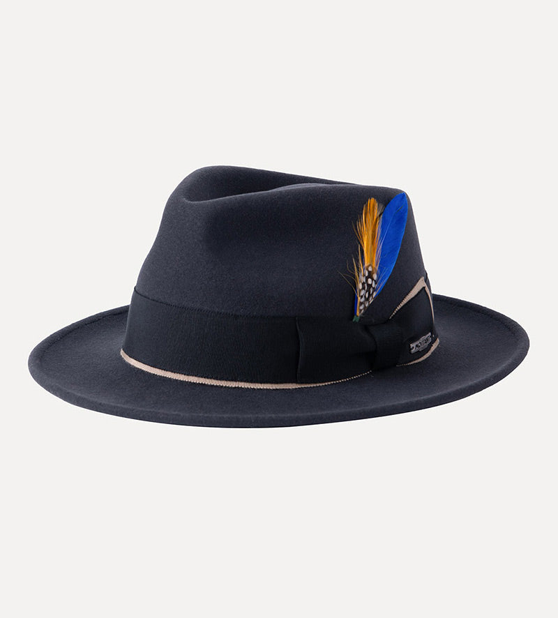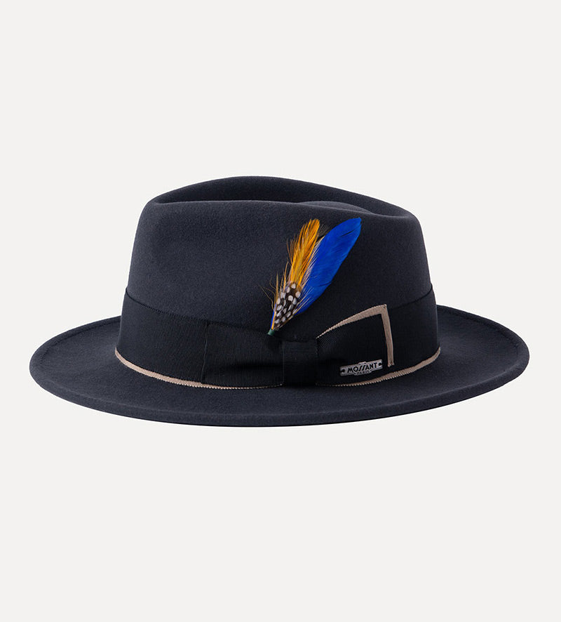 Mossant is a famous brand from France with cult status, which made this man feel Fedora in the land of unlimited possibilities. The plain-coloured design is elegantly rounded off by the harmoniously coordinated grosgrain ribbon which holds a playful feather decoration. Wool and cashmere quality gives the outdoor hat its ultra-lightweight proving invaluable on every trip. With a cotton blend lining band.