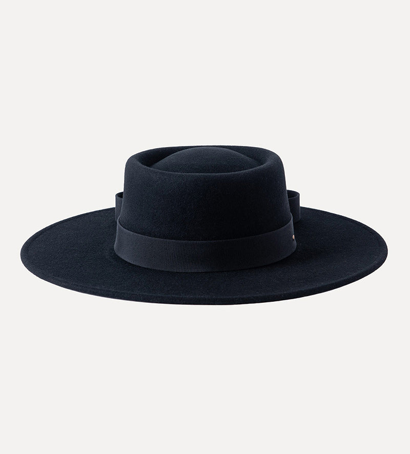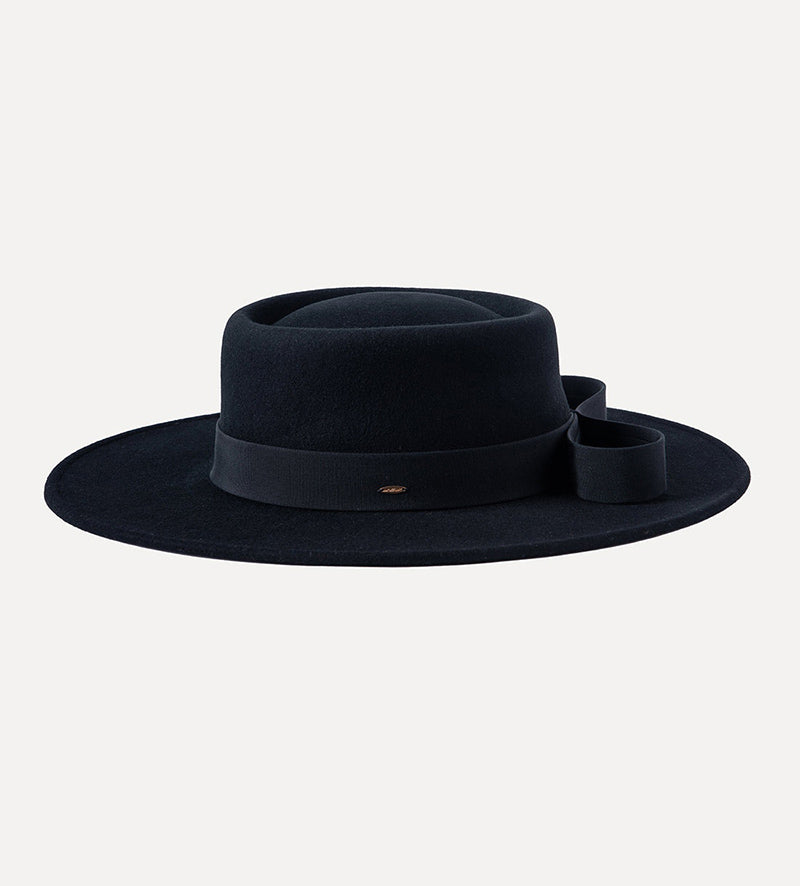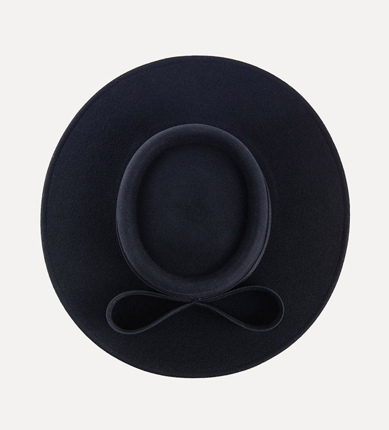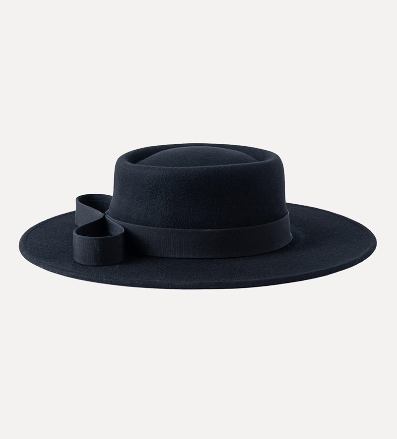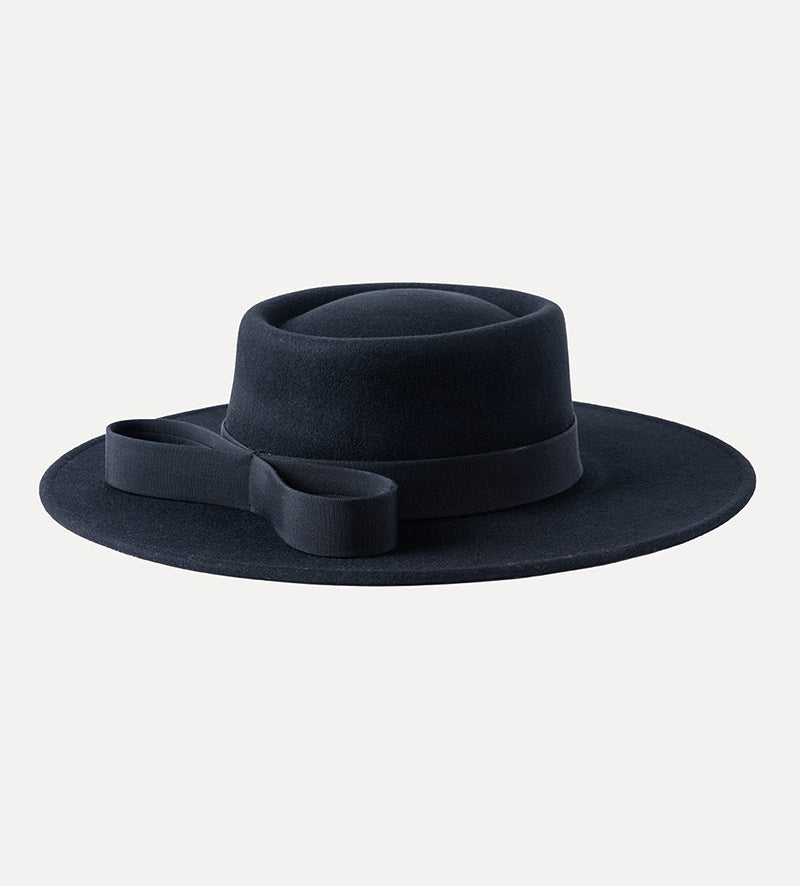Wool felt gives this wide-brim pork pie hat from Mossant a textured suppleness and warmth, while the hat's entire finish reveals its handmade quality. Its characteristic shape with wide brim gives the felt hat its quirky charm, which, combined with the plain-colored design and grosgrain ribbon trim with a big knot on the front, results in its unconventional charming beauty.