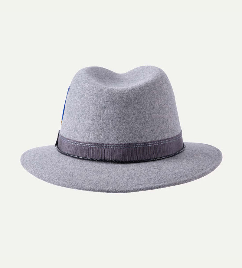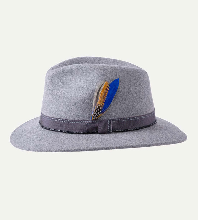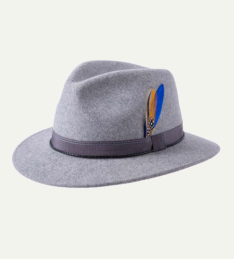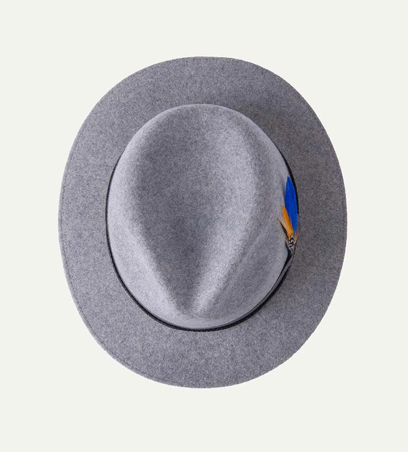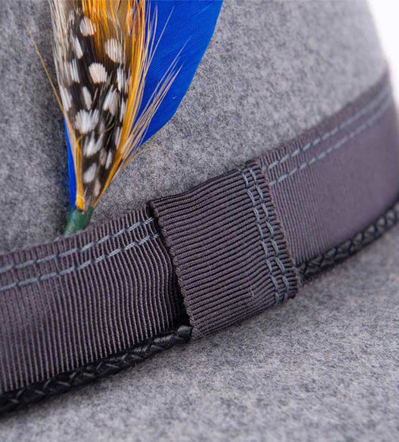Most hats for men are made in wool and cashmere. With its typical fedora shape, this stylish grey fedora hat from Mossant enhances stylish outfits with its excitingly elegant charm. The high-quality hats' harmonious coloring adds a modern touch. The beautiful grosgrain ribbon, which ends in a fabric buckle and a colorful feather inserted, stands in stark contrast to the fabric of the rest of the carefully crafted fedora.
