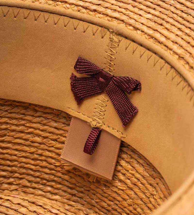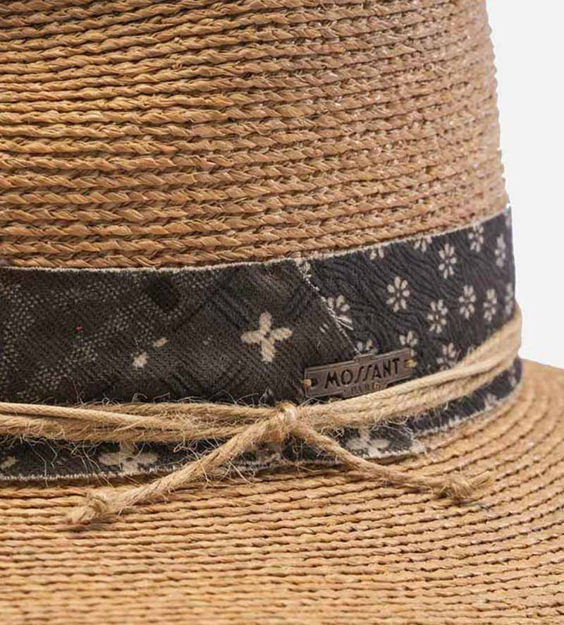 The distinctive look of raffia straw gives this stylish flat straw hat from Mossant a natural and stylish appearance. The sophisticated structure of the carefully crafted material emphasizes the charming spirit of this high-quality headgear just as beautifully as the contrast-colored grosgrain ribbon, which is subtly decorated with a rough edge and vintage dyeing effect. With two hemp ropes as the decoration.
