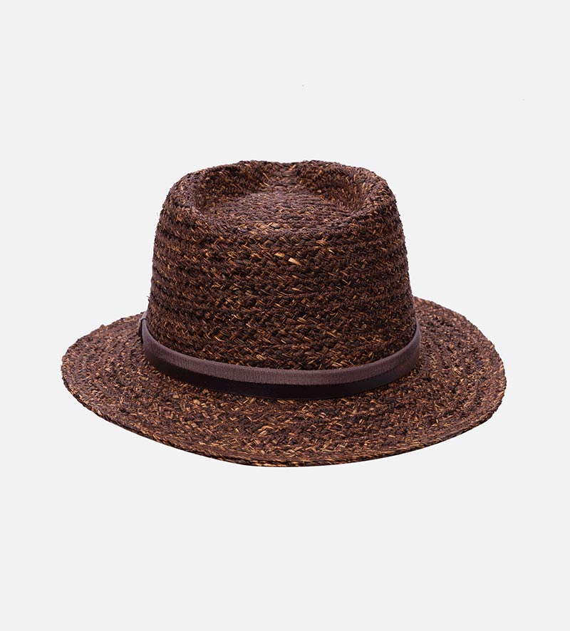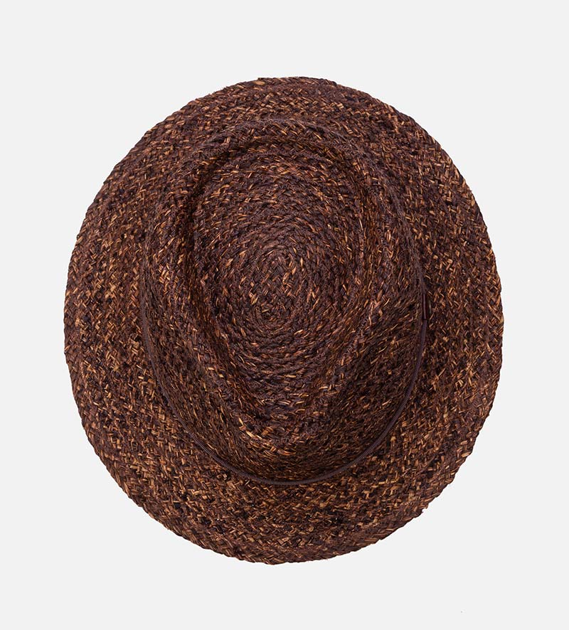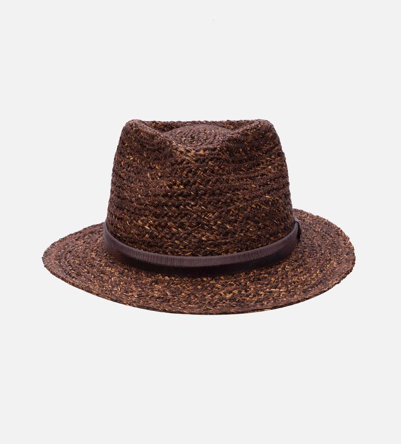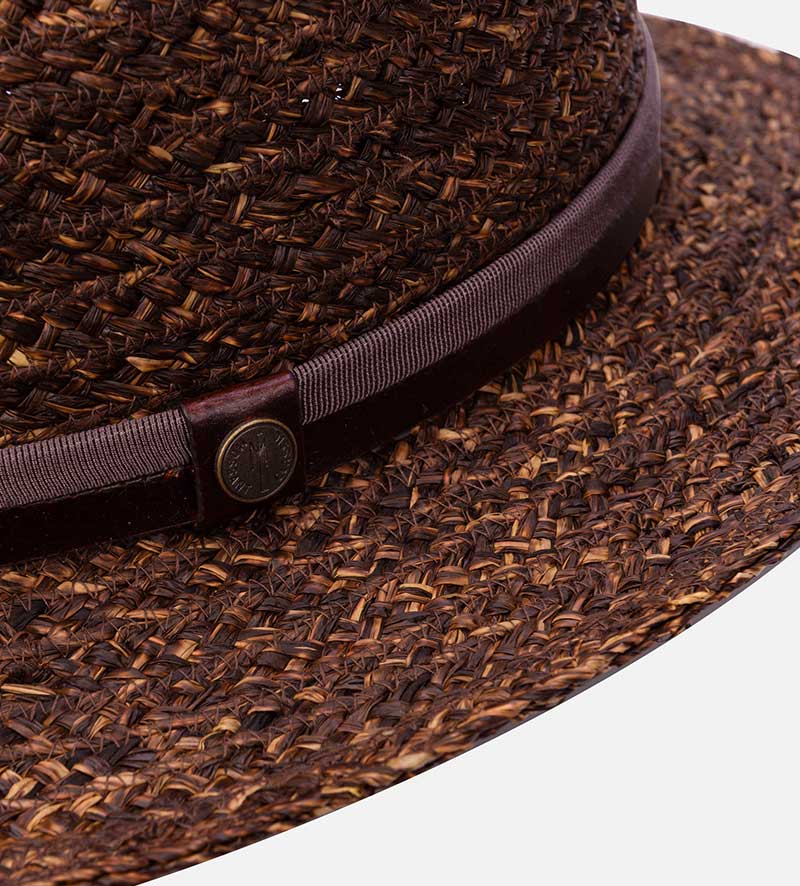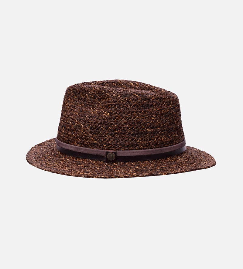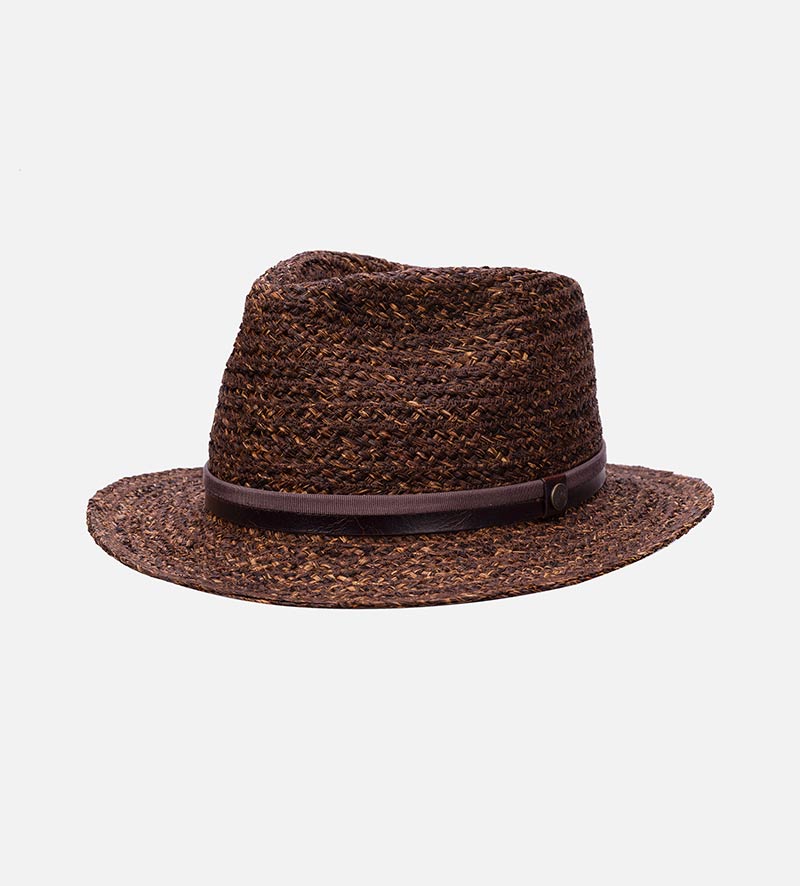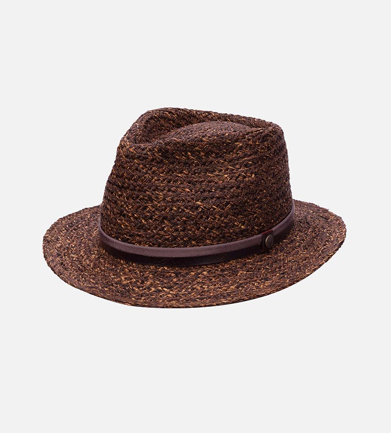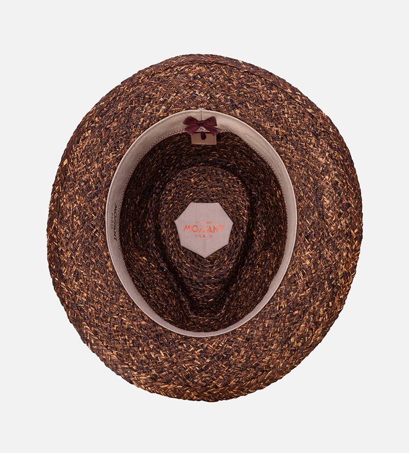 This classic elegance hat woven from high-quality raffia straw gives a characterful appearance by its stlylish fedora shape ----just as you would expect from Mossant. Its classic shape with a flat brim stands in exciting contrast with its stylishly heathered material. Two bright colors attract the eye. A carefully crafted leather trim half-wrapped by the grosgrain band stylishly rounds off the look. With the round stellic brand emblem at the side.