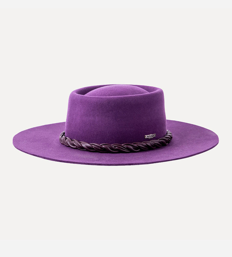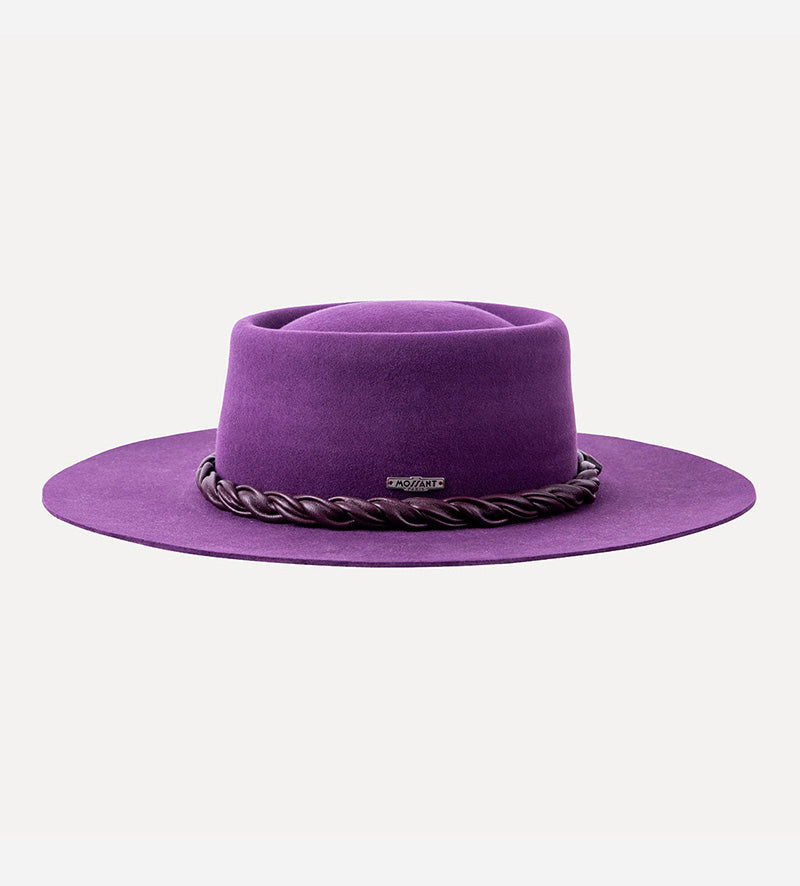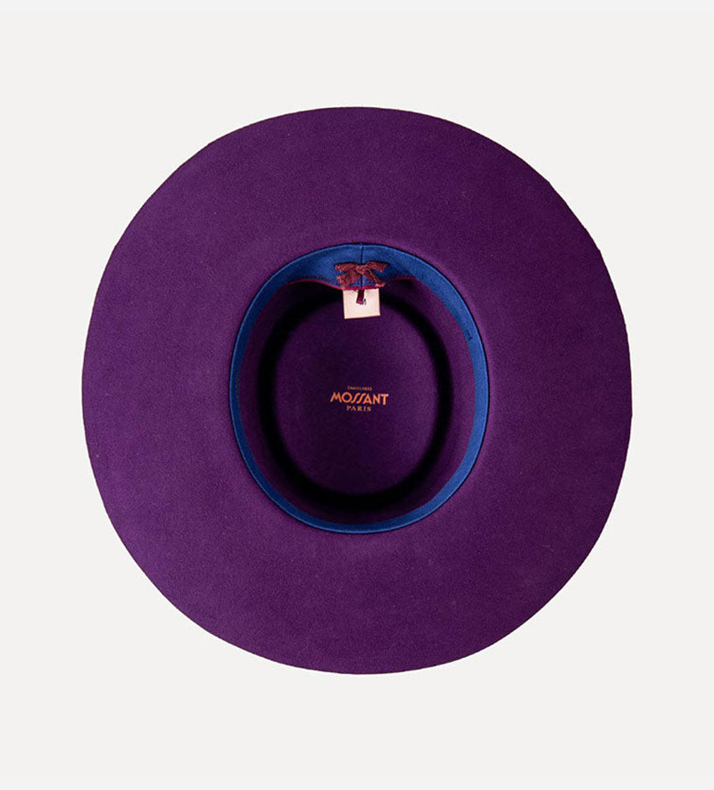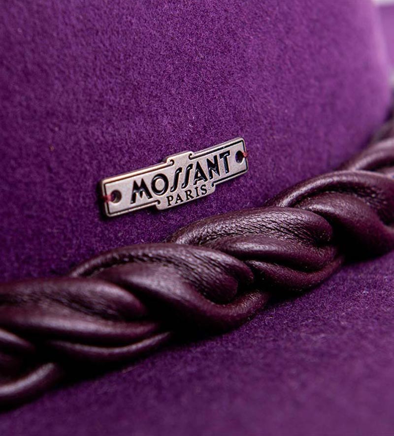 With a gallantly wide brim. This classic purple fedora hat from Mossant attracts attention with its luxurious appearance. The charming details that make up the charismatic look of the headgear are highlighted to perfection by contrasting colors.