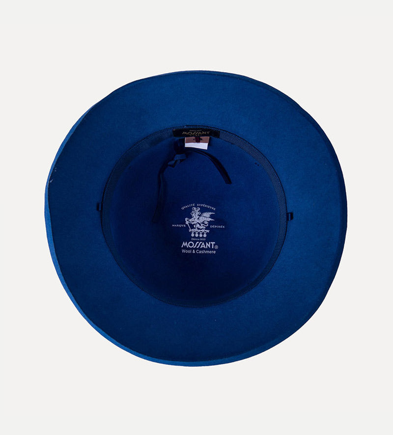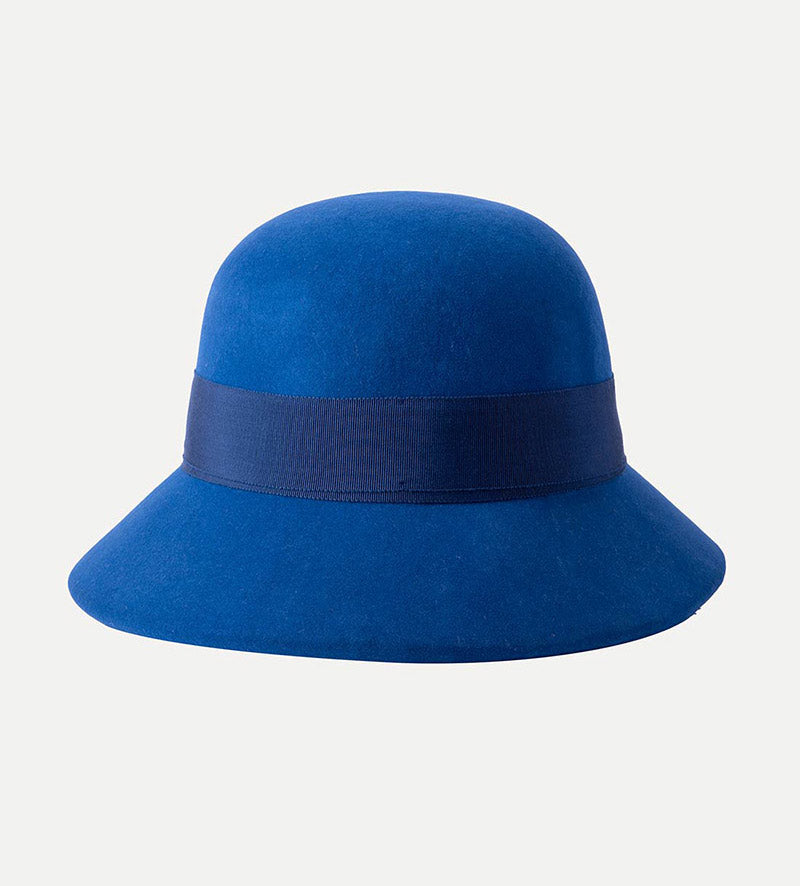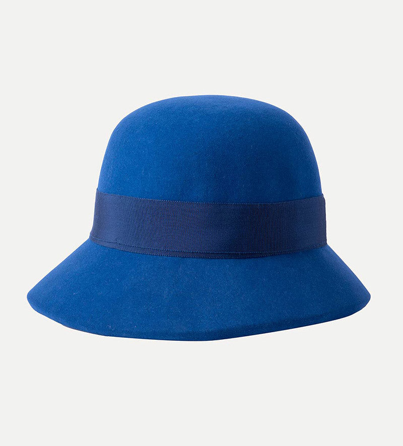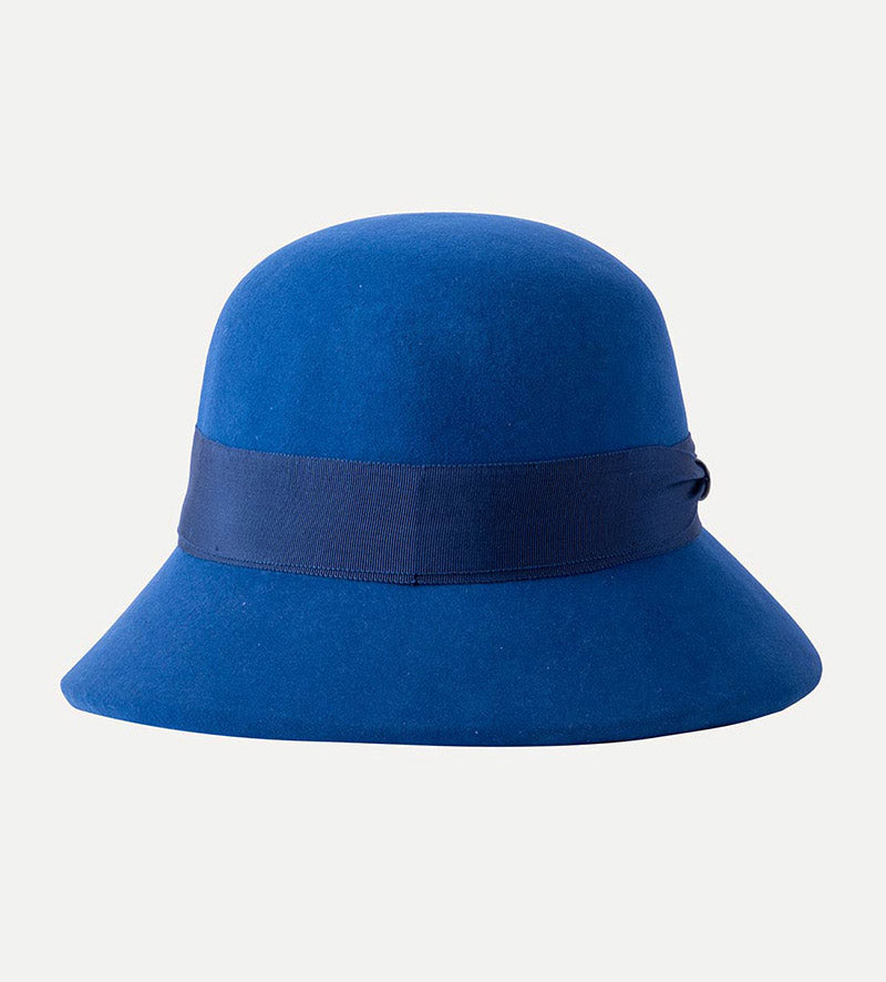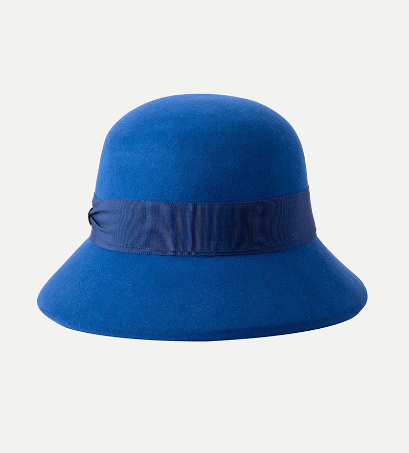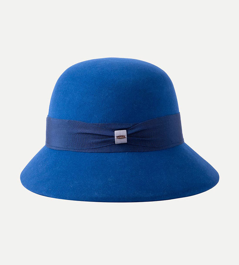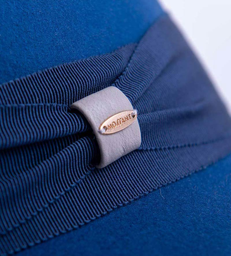 The women's smart wool cloche hat from Mossant is made of wool and cashmere. Its shape makes this handmade felt hat look romantic and elegant. The hat's character charisma is emphasized by a pretty grosgrain ribbon, which attracts attention with its contrast-coloured accents and a golden emblem fixed on the side of the hat body. The restrained appearance of the plain-colored felt material means this stylish cloche offers numerous options for creating stylish and modern outfits.